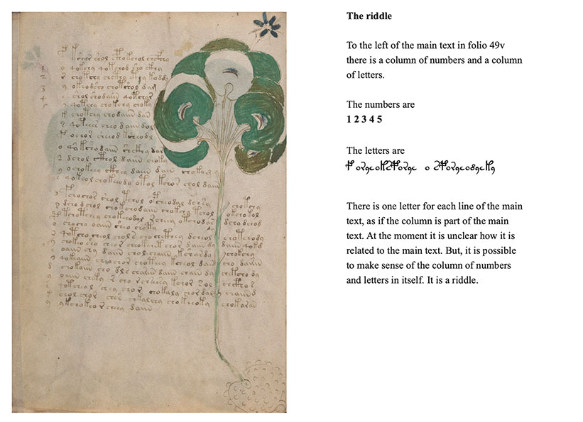 In folio 49v there is a column of numbers and a column of letters to the left of the main text. It is a riddle. (READ)