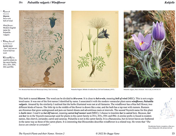 Tests of the deciphering in the botanical section of the manuscript lead to plants that match the illustrations. By now my studies offer matches, both by name and morphology, for 127 of the 129 plants. From the plant names the aim is to verify the decoding and build an understanding of how the cipher is used to express the sounds in the language. From this it will be possible to move on to translate other parts of the manuscript.